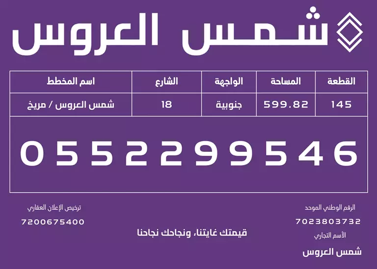رخصة الإعلان:7200675400تاريخ الإصدار:11/09/2025تاريخ نهاية رخصة الاعلان:27/07/2026الضمانات ومدتها:لايوجدالالتزامات الأخرى على العقار:لا يوجد حسب اقوال المالك