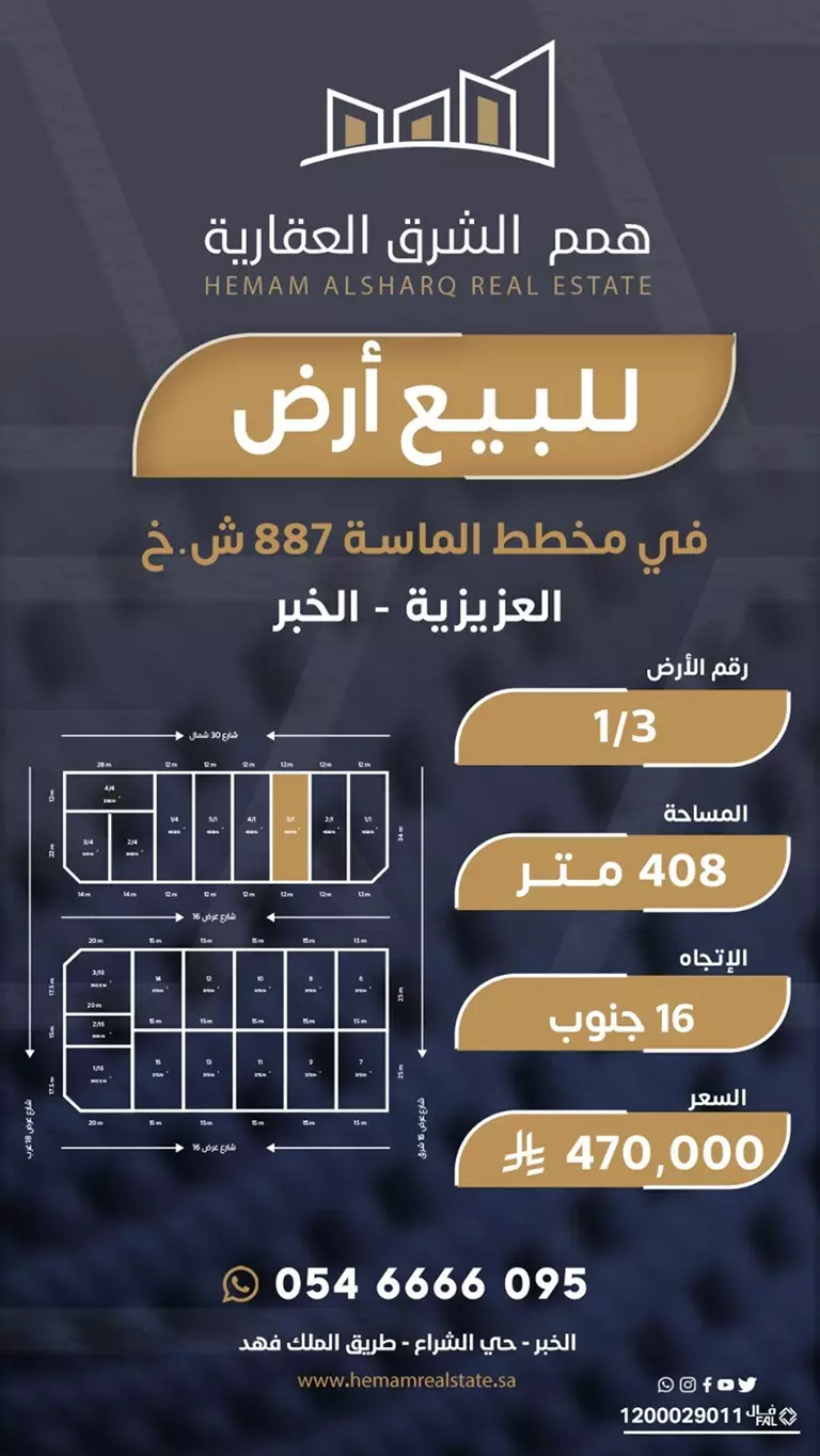 لبيع انصاص اراضي متجاروات بمخطط الماسة 887 ش خ بعزيزية الخبر