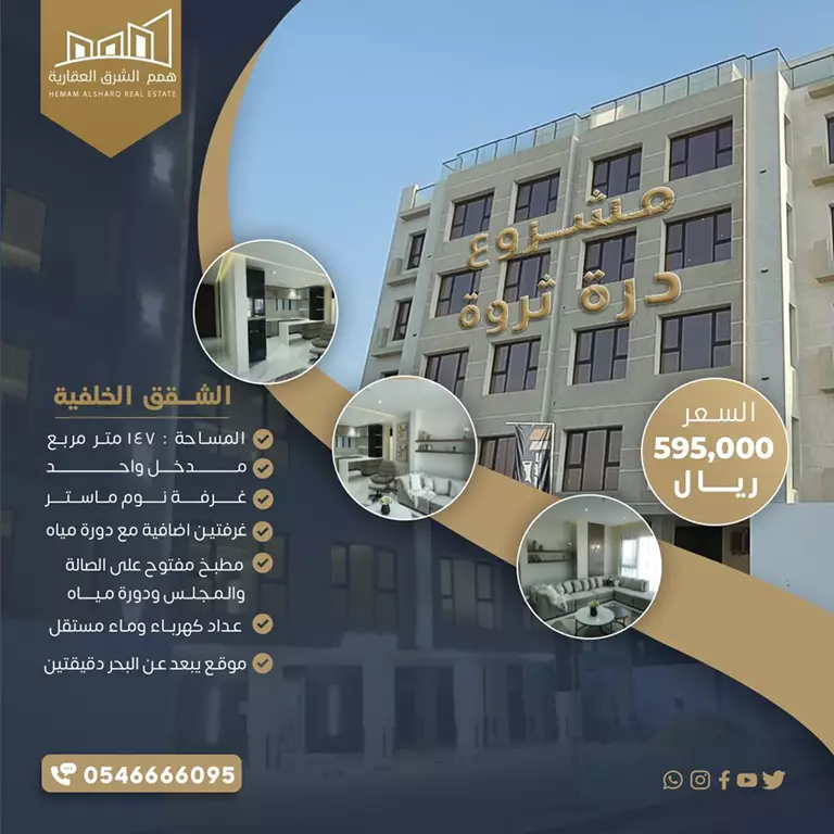 الشقة رقم 3 / 1 في الدور الأول من العقار رقم 2567 المقام على قطعة الارض 99 من البلك رقم 14 المجاورة الأولى المخطط رقم ش د 1450 السيف بمدينة الدمام مساحة الوحدة من الأرض 56.93 متر وتختص من المنافع والأجزاء المشتركة بمساحة 106.09 متر