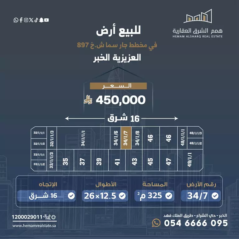 شرق بعرض (  16 م  ) الواجهة : (  12م  )