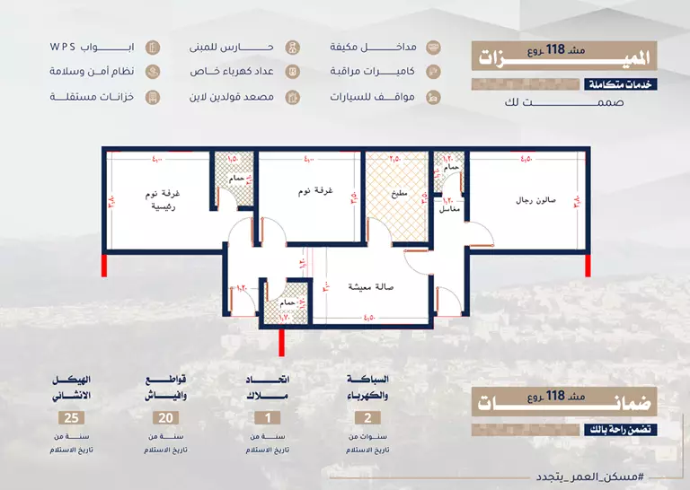 حي البوادى بمدينة جدة مساحة الوحدة من الأرض 28.39 متر وتختص من المنافع والأجزاء المشتركة بمساحة 60.53 متر